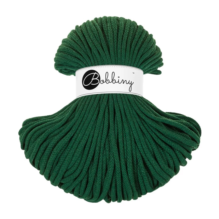 Prémium Bobbiny 5 mm zsinórfonal Pine Green színben, amely ideális választás horgoláshoz, makraméhoz és egyedi kézműves projektekhez. A mély, fenyőzöld árnyalat természetes és elegáns megjelenést kölcsönöz az elkészült alkotásoknak, így tökéletes választás modern és természetközeli stílushoz.