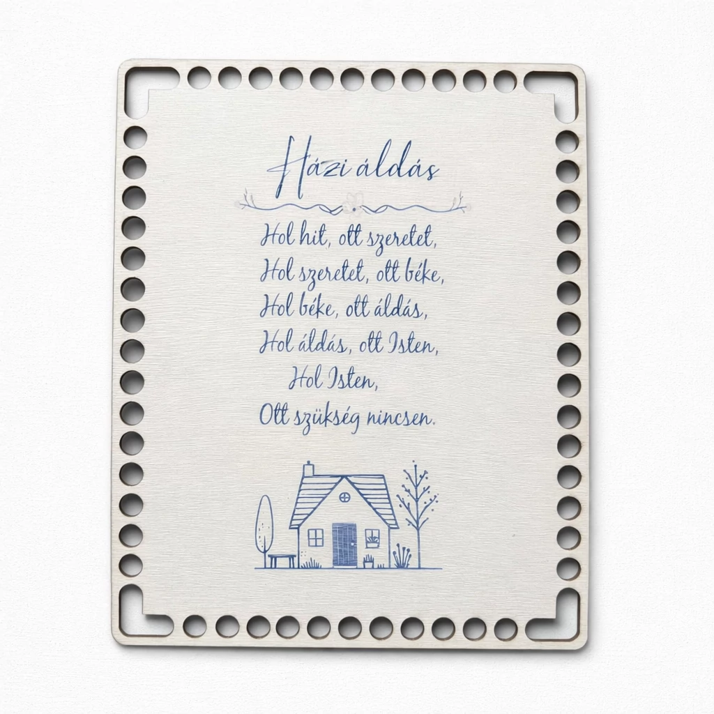 Színes, szublimált „Házi áldás” mintás horgolható fa alap, amely dekoratív és különleges választás ajándéknak vagy saját készítésű alkotásokhoz.