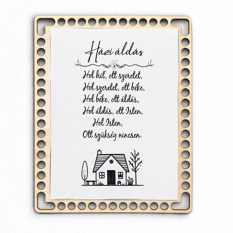 Ez a különleges házi áldás horgolható fa alap tökéletes választás, ha egy igazán egyedi és meghitt dekorációt szeretnél készíteni vagy ajándékozni. A finoman megmunkált fa keret és a középen elhelyezett, szublimált mintás tábla elegáns, letisztult megjelenést biztosít.