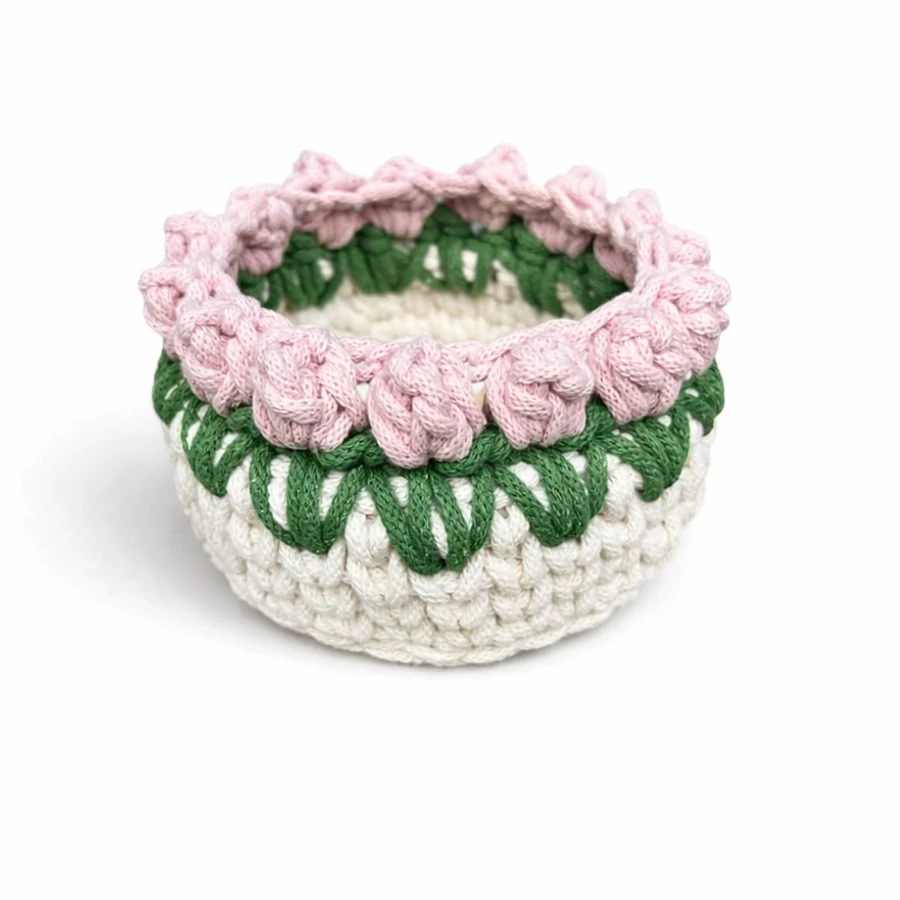 Ez a horgolt kosár kézzel készült, minőségi 5 mm-es Splendid zsinórfonalból. Az ekrü alapot zöld és púder színű díszített perem teszi igazán egyedivé.