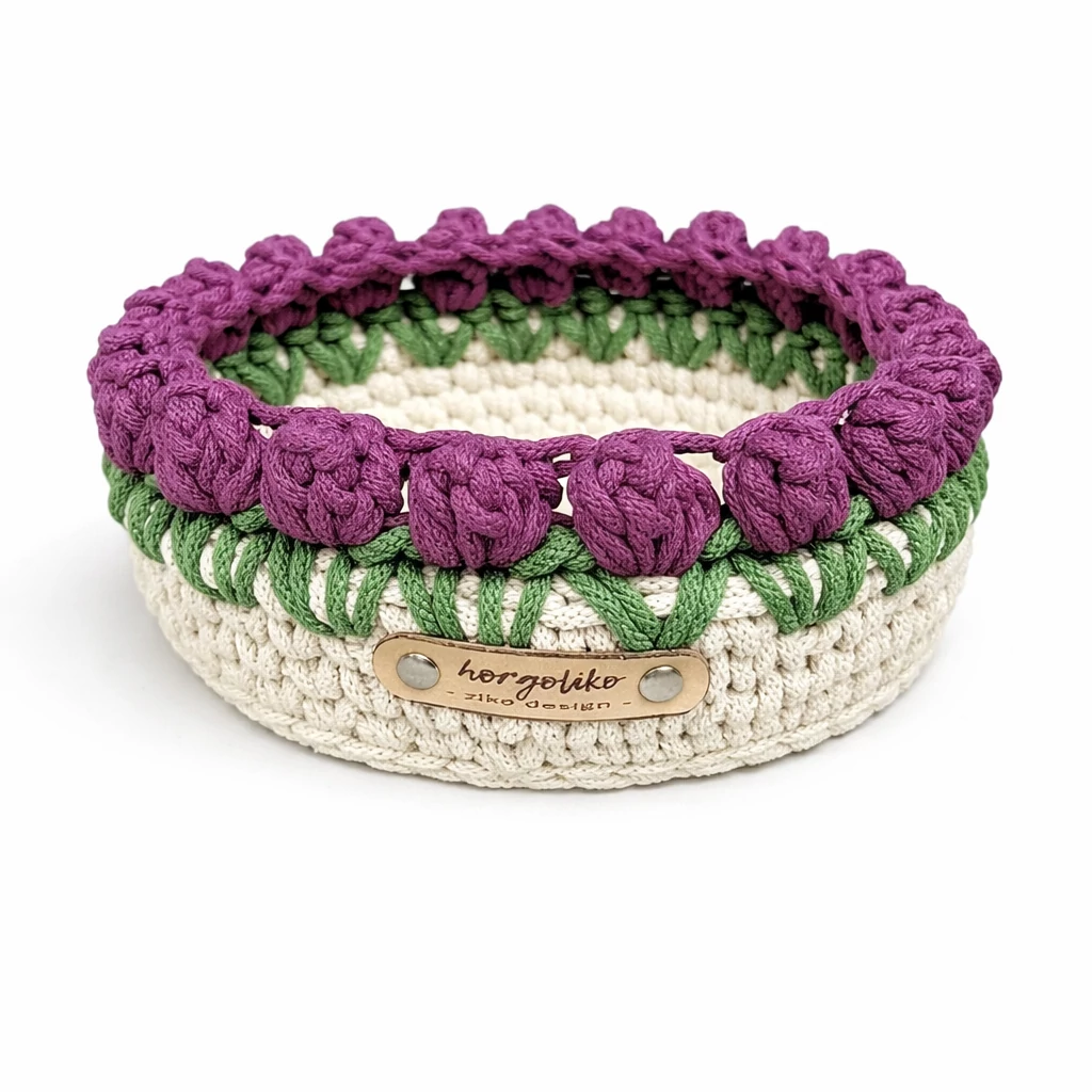 Ez a horgolt kosár kézzel készült, minőségi 5 mm-es Splendid zsinórfonalból világosbézs színben. A zöld és mályva színű díszített perem egyedi és különleges megjelenést biztosít.