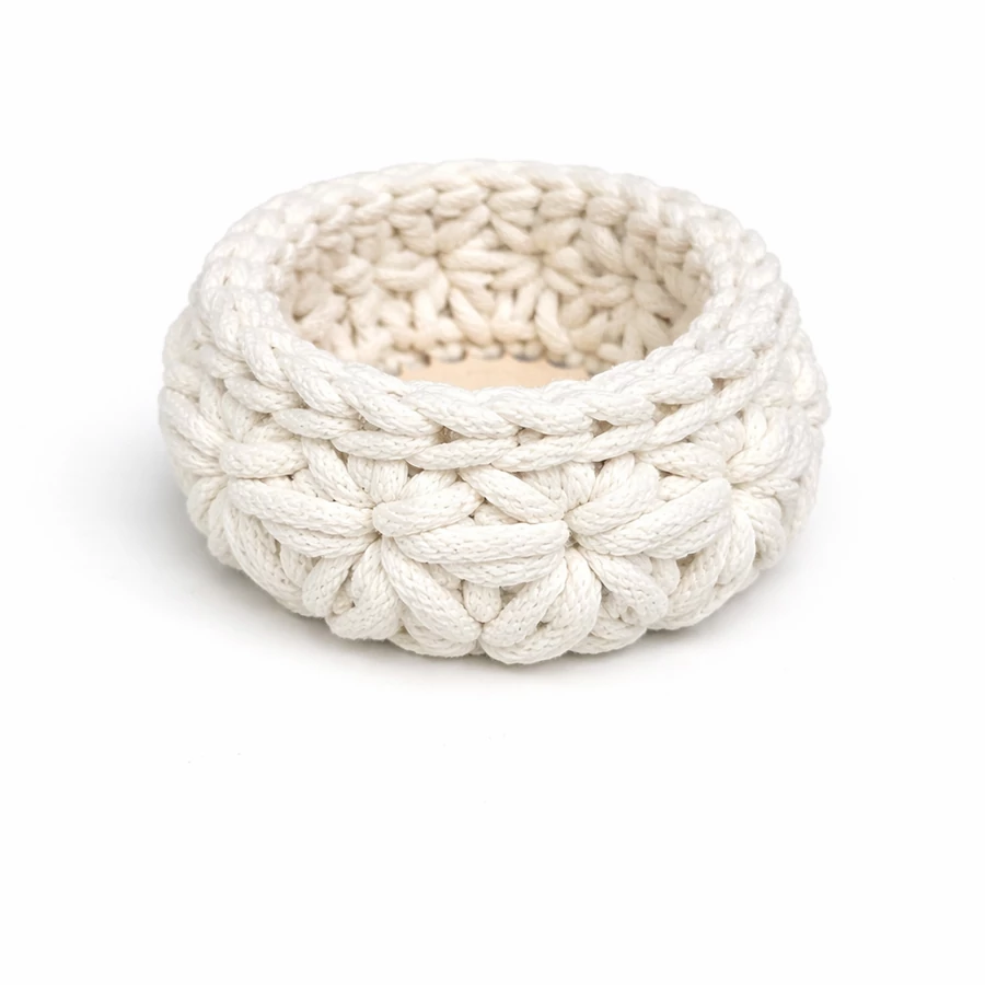 Ez a kézműves horgolt kosár kisebb méretének köszönhetően tökéletes választás apró tárgyak tárolására vagy dekorációként.