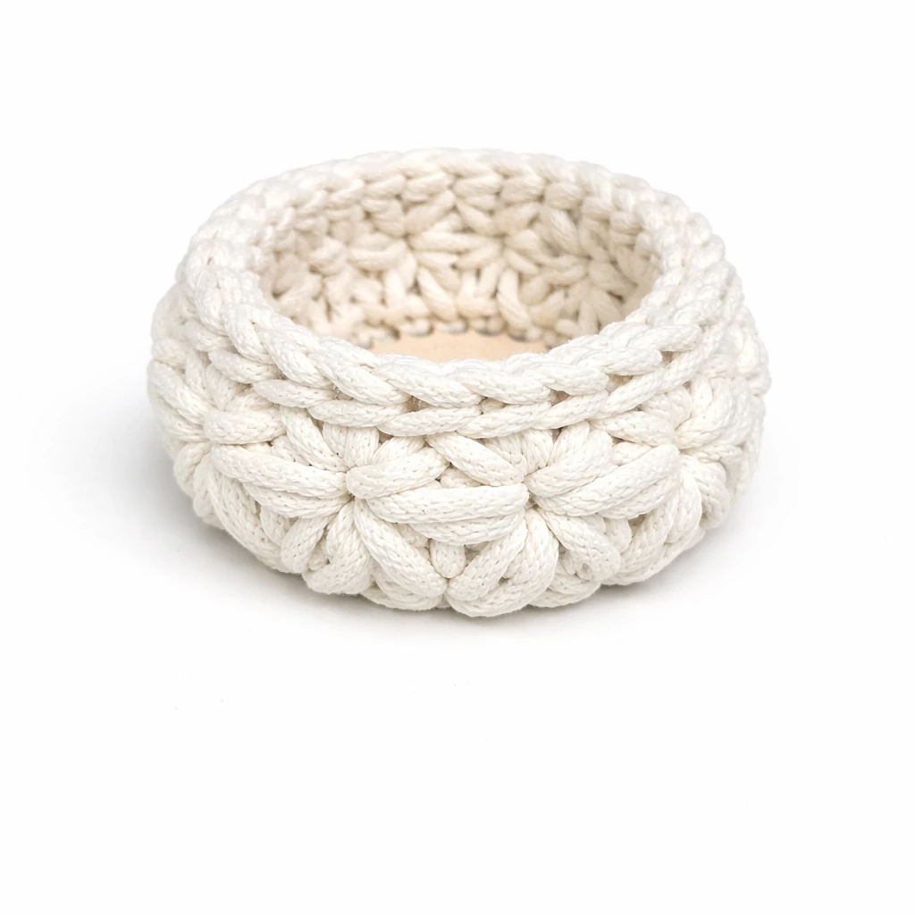 A kosár horgolható fa alapra készül, amely extra merevséget és prémium megjelenést biztosít.