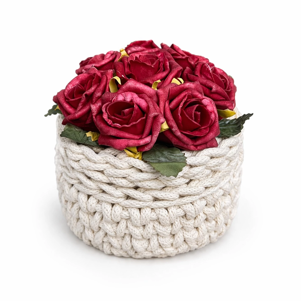 A horgolt kosár horgolható fa alapra készül, amely extra merevséget és prémium megjelenést biztosít.