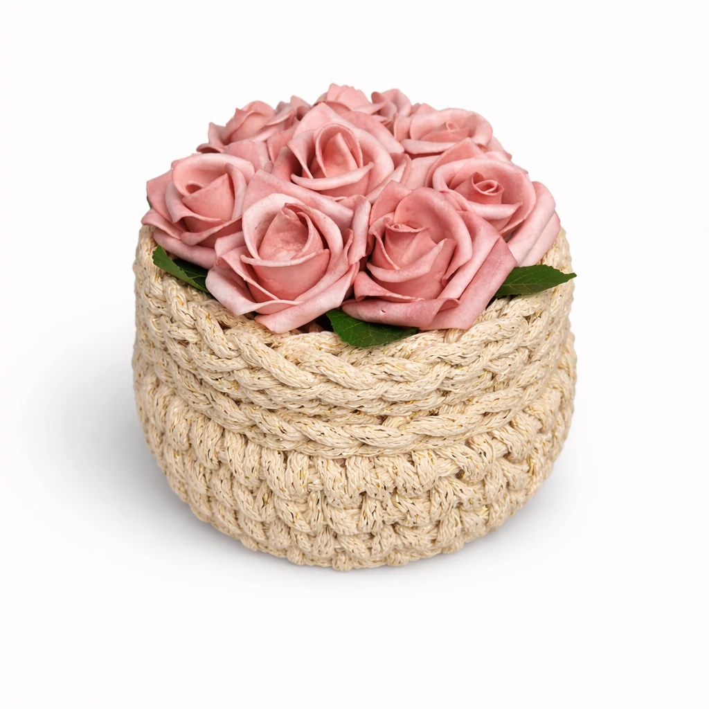 A horgolt kosár horgolható fa alapra készül, amely extra merevséget és prémium megjelenést biztosít.
