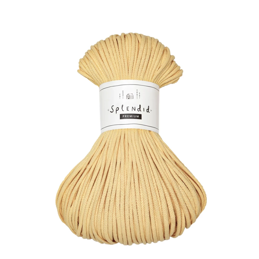 z 5 mm-es prémium Splendid zsinórfonal  újrahasznosított pamutból készül, a közepén a színével azonos pamut “maggal”. A minőségi textúra, kiválóan alkalmassá teszi az egyedi technikák alkalmazásával készített horgolt, kötött, vagy makramézott alkotásokhoz.