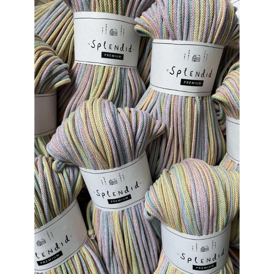Az 5 mm-es prémium (kevert szálas) Splendid zsinórfonal újrahasznosított pamutból készül, a közepén a színével azonos pamut “maggal”. A minőségi textúra, kiválóan alkalmassá teszi az egyedi technikák alkalmazásával készített horgolt, kötött, vagy makramézott alkotásokhoz.