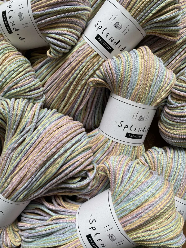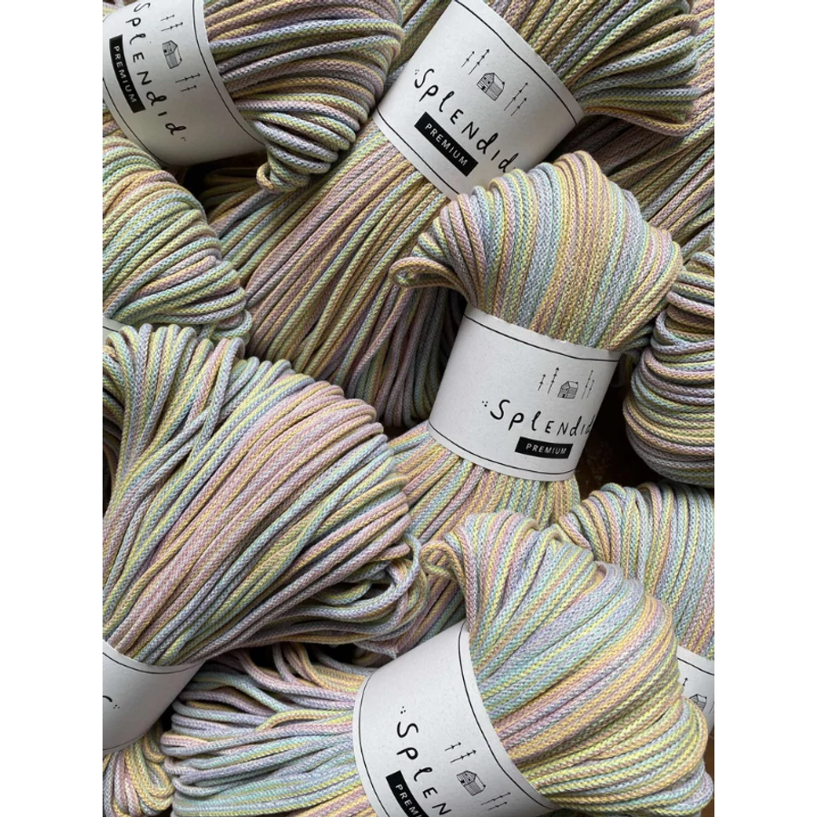 A 3 mm-es (kevert szálas) prémium Splendid zsinórfonal kizárólag újrahasznosított pamutból készül. A minőségi textúra, kiválóan alkalmassá teszi az egyedi technikák alkalmazásával készített horgolt, kötött, vagy makramézott alkotásokhoz.