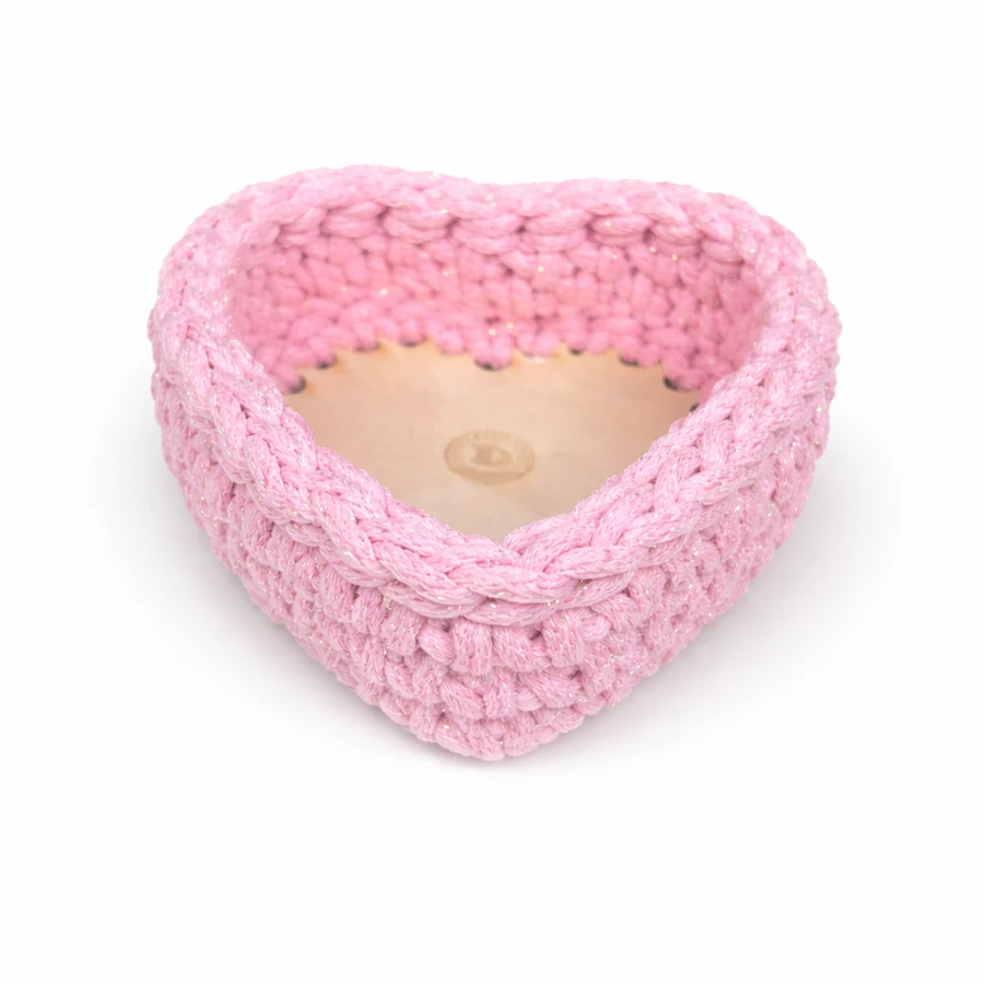 A kosár horgolható fa alapra készül, amely extra merevséget és prémium megjelenést biztosít.